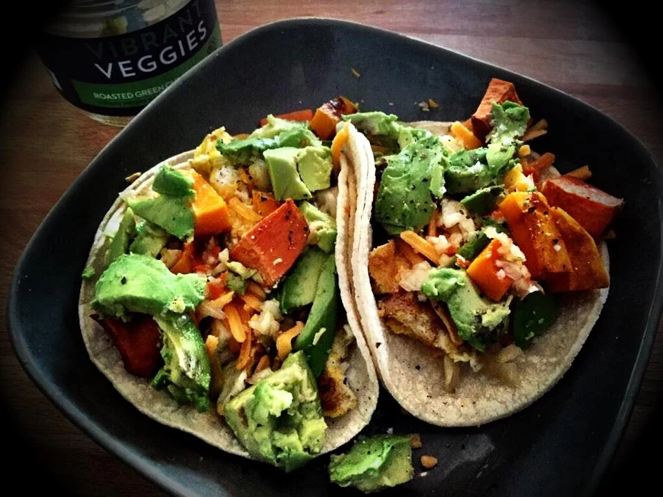 Breakfast burritos made with butternut squash, sweet potatoes, avocado, eggs and topped with Vibrant Veggies' Roasted Green Chile kraut. Breakfast of champions!