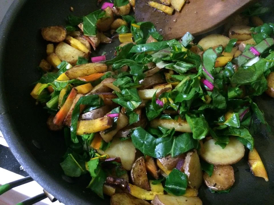Garden fresh hash. Fingerling potatoes, carrots, garlic and rainbow shard combine to make a perfect breakfast or dinner. Top this bad boy with Vibrant Veggies' Morrocan Fusion kraut and you've got a winner!