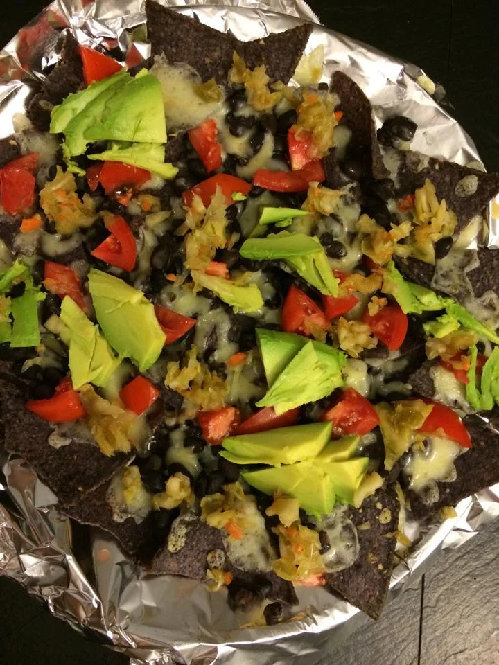 Nachos topped with heirloom tomatoes, black beans, cheddar cheese, avocado and Vibrant Veggies' Roasted Green Chile kraut. Never better!